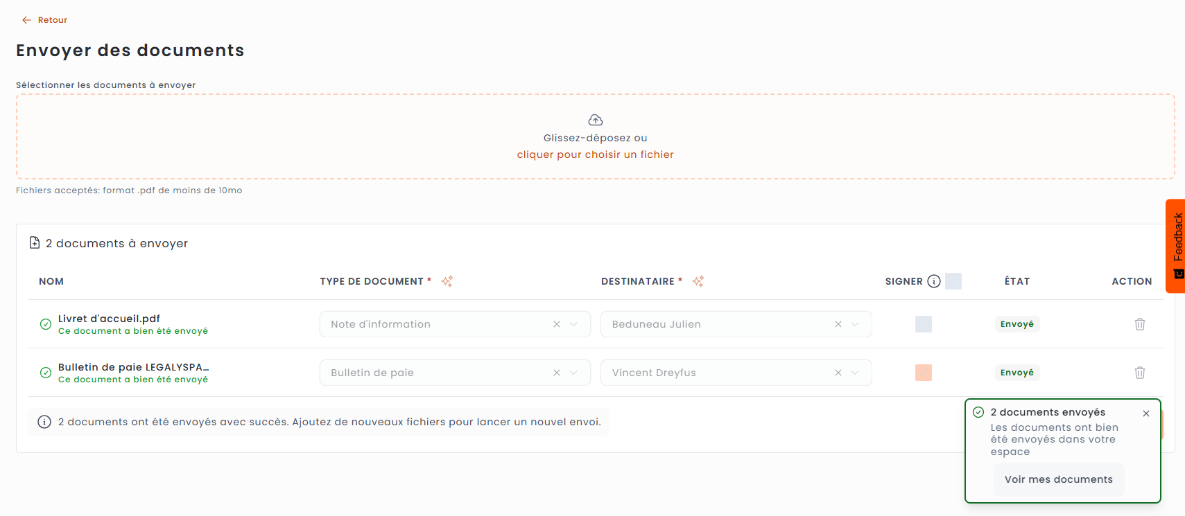 Vos documents ont bien été envoyés et importés dans votre espace avec le statut "envoyé".