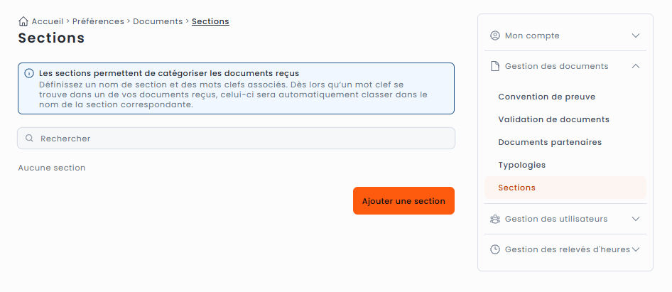 La notion de « section » est un filtre qui cloisonne, au sein d’une même entreprise, ses documents en fonction de ses services, ses chantiers, ses affaires, etc. Les sections permettent le classement, le routage et les accès aux documents par utilisateurs ou profils.