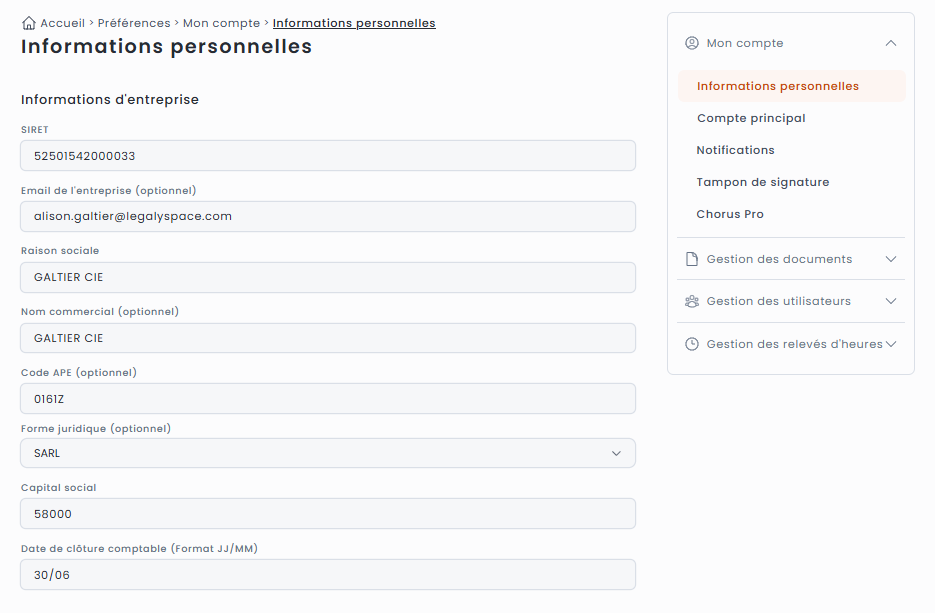 C'est la carte d'identité numérique de l'entité et la modification d'un élément va générer automatiquement l'envoi d'un nouvelle convention de preuve à l'ensemble de vos partenaires (Salariés, Clients, Fournisseurs...)