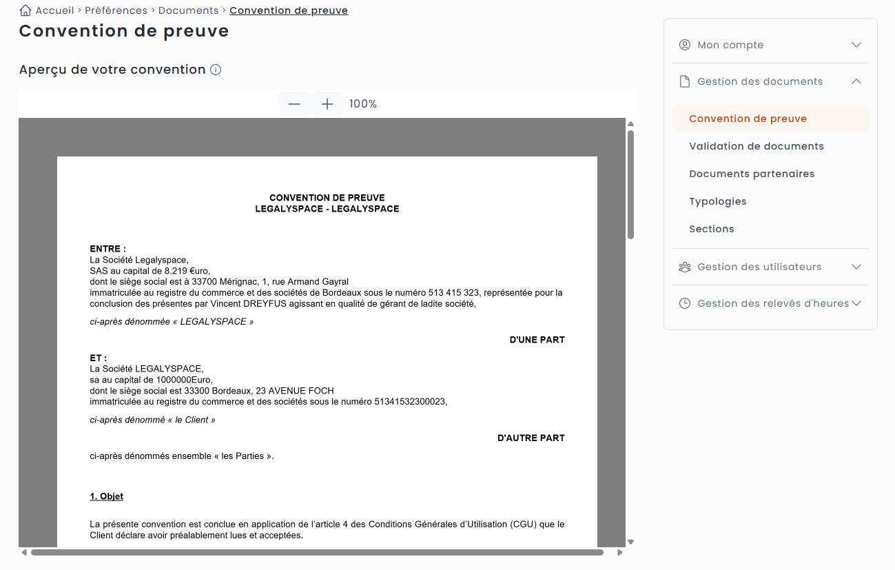 La convention de preuve est un contrat liant deux parties qui reconnaissent utiliser LegalySpace pour échanger tous types de documents et leurs donner une valeur légale.