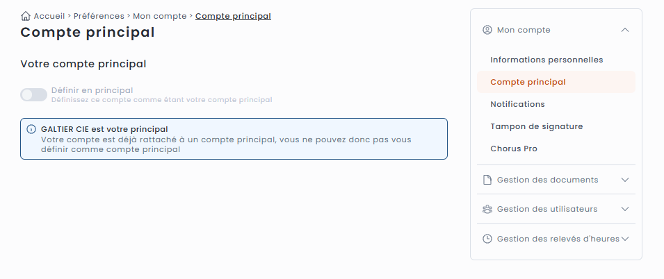 - Sur un compte secondaire rattaché, le bouton "Définir come principal" sera désactivé / grisé comme ci-dessous