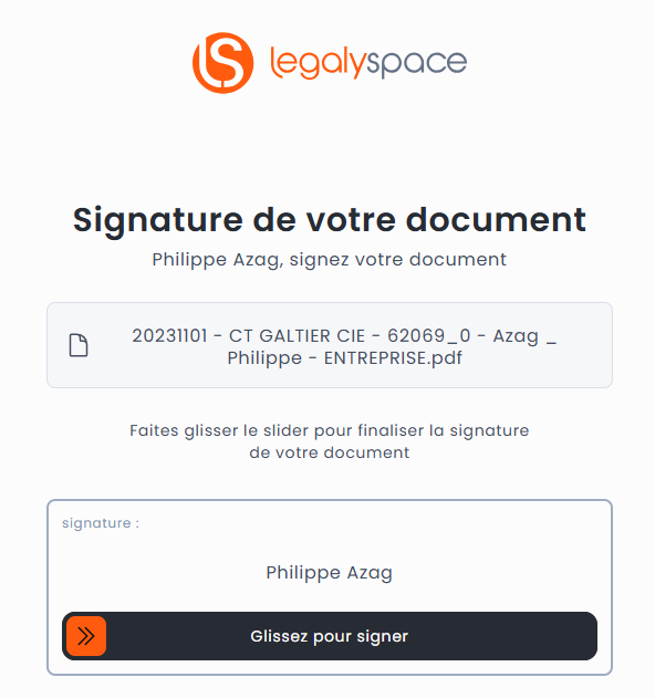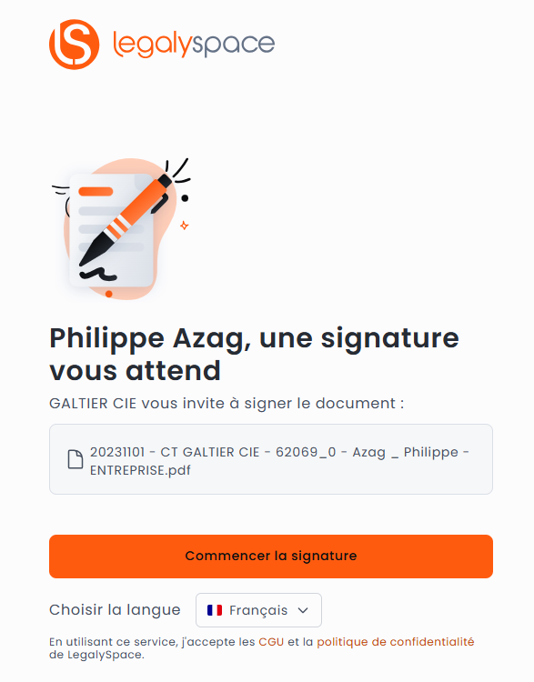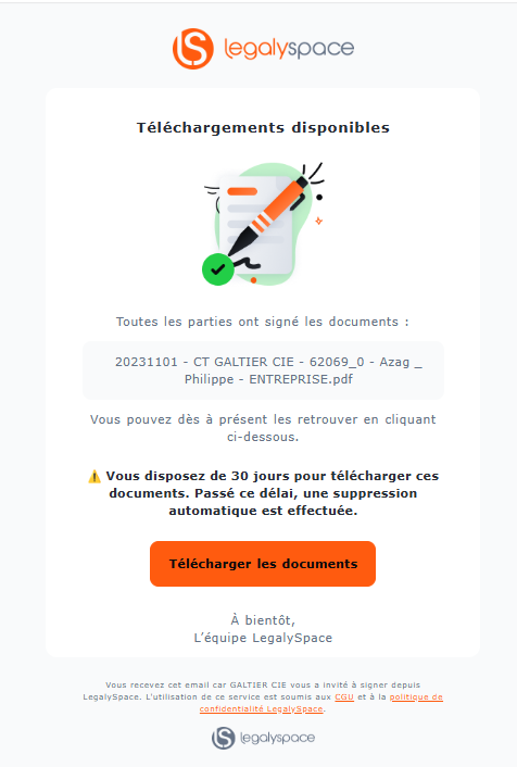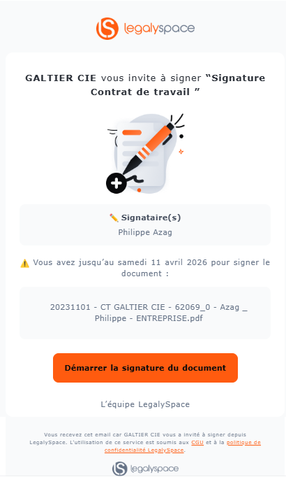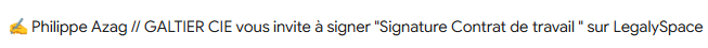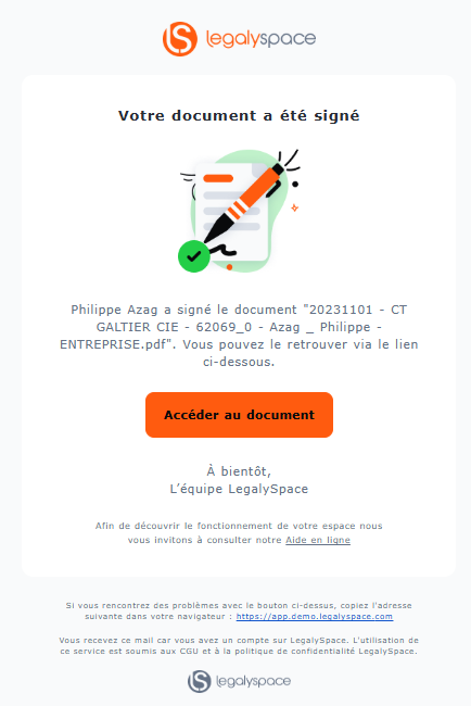 Les destinataires n’ayant pas ouvert leur espace LegalySpace recevront une demande de signature du document directement par mail via un lien de signature.