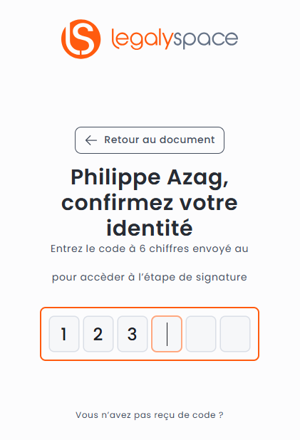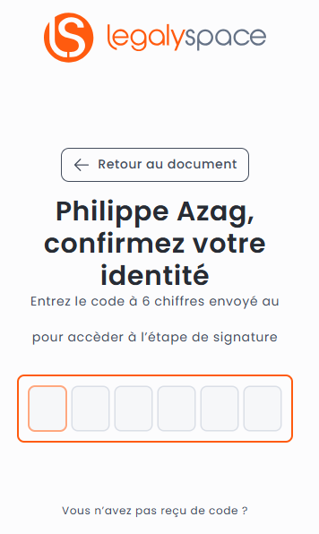 => Vous devez indiquer le code de signature à 6 chiffres reçu par SMS dans les 6 cases dédiées afin d'accéder à l'étape de signature.